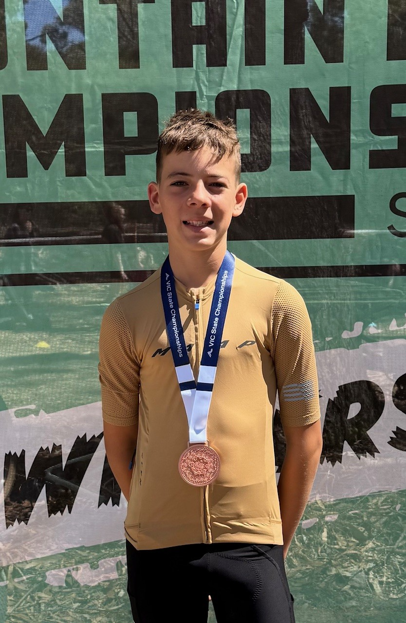 Competing in the Under 15 Men’s Cross-Country Olympic (XCO) category, Spencer delivered a strong and determined performance to secure third place in the state — an impressive achievement in a highly competitive field.